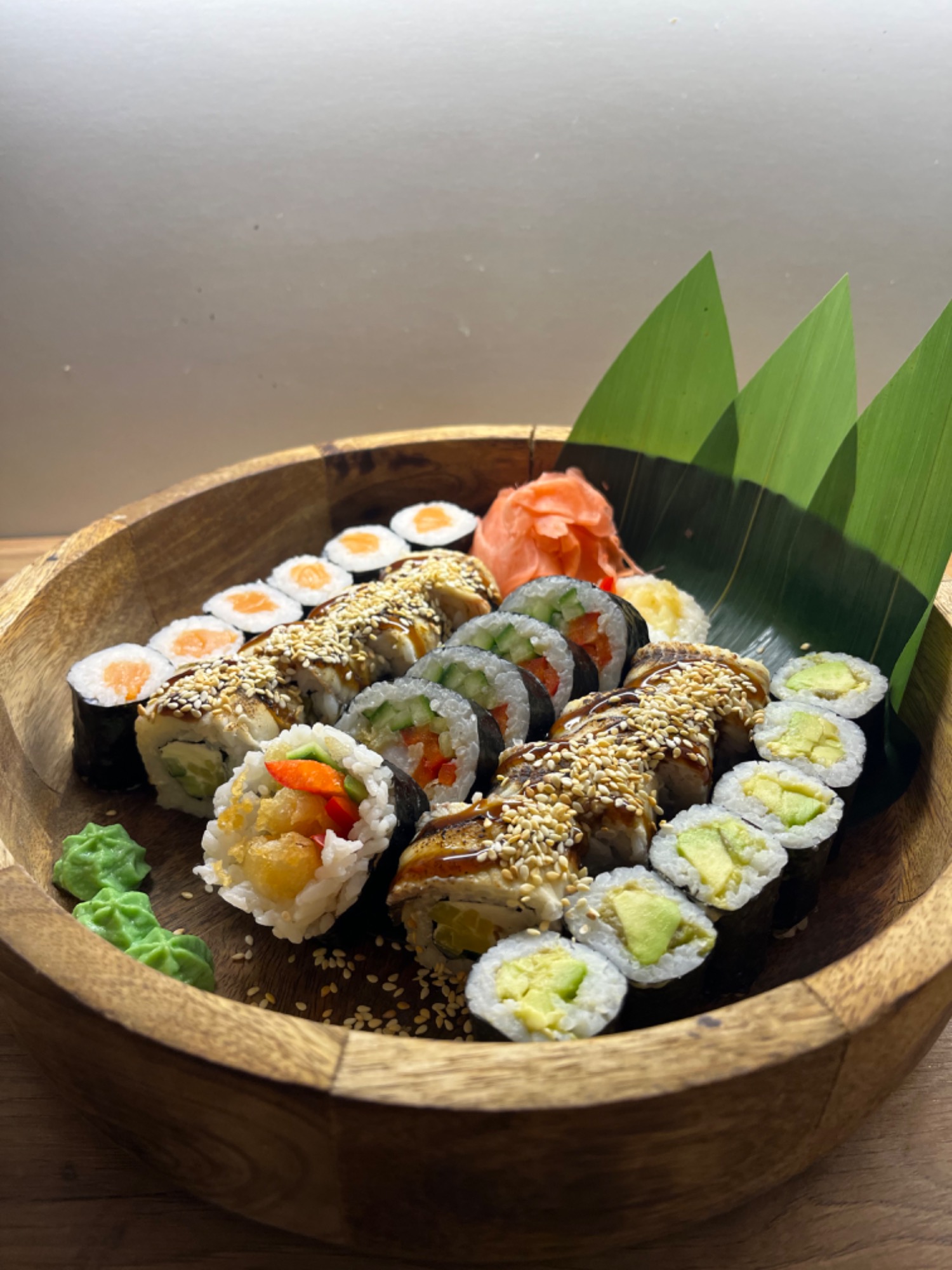 Łosoś, tuńczyk, węgorz, krewetki, maślana, wakame, ogórek, imbir, wasabi