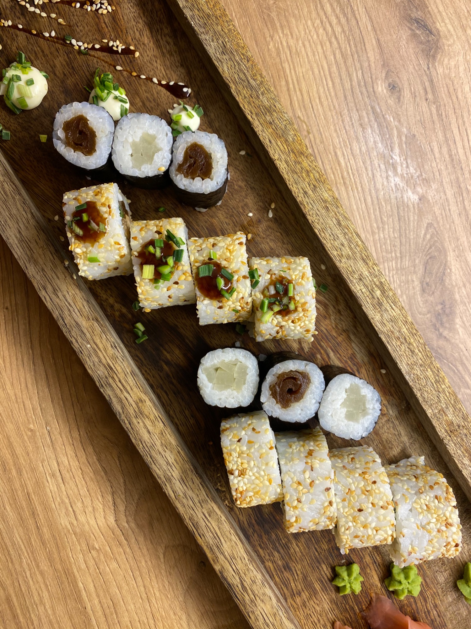 (Maślana, takuan, kanpyo, tobiko, sos spicy, sezam)