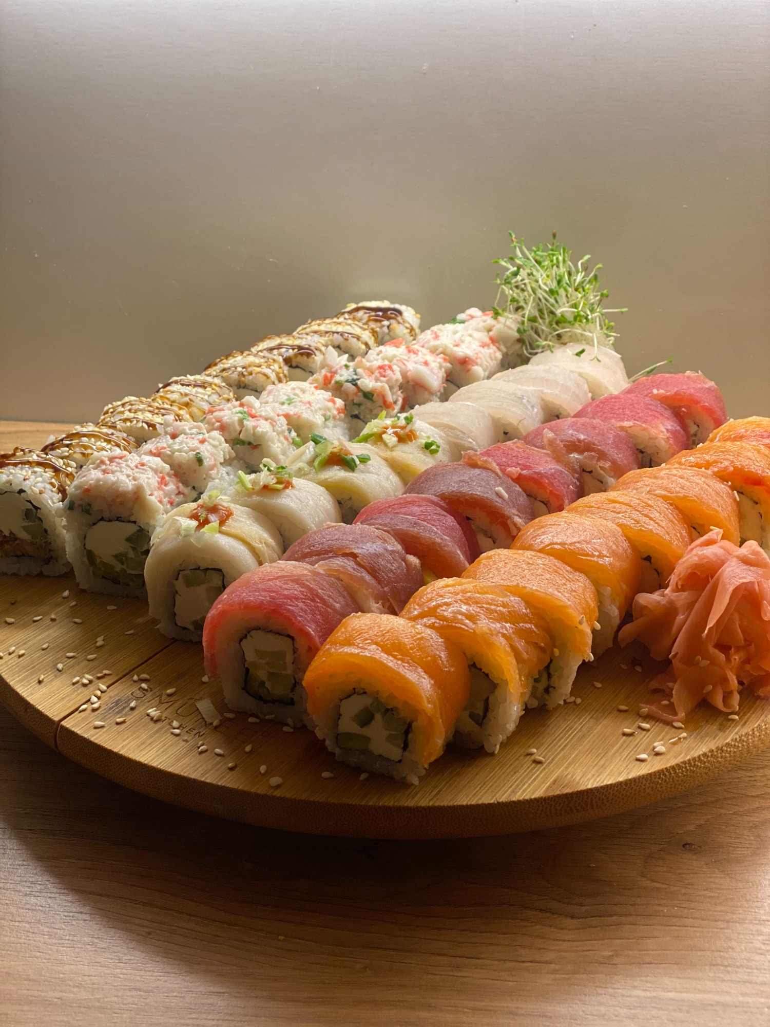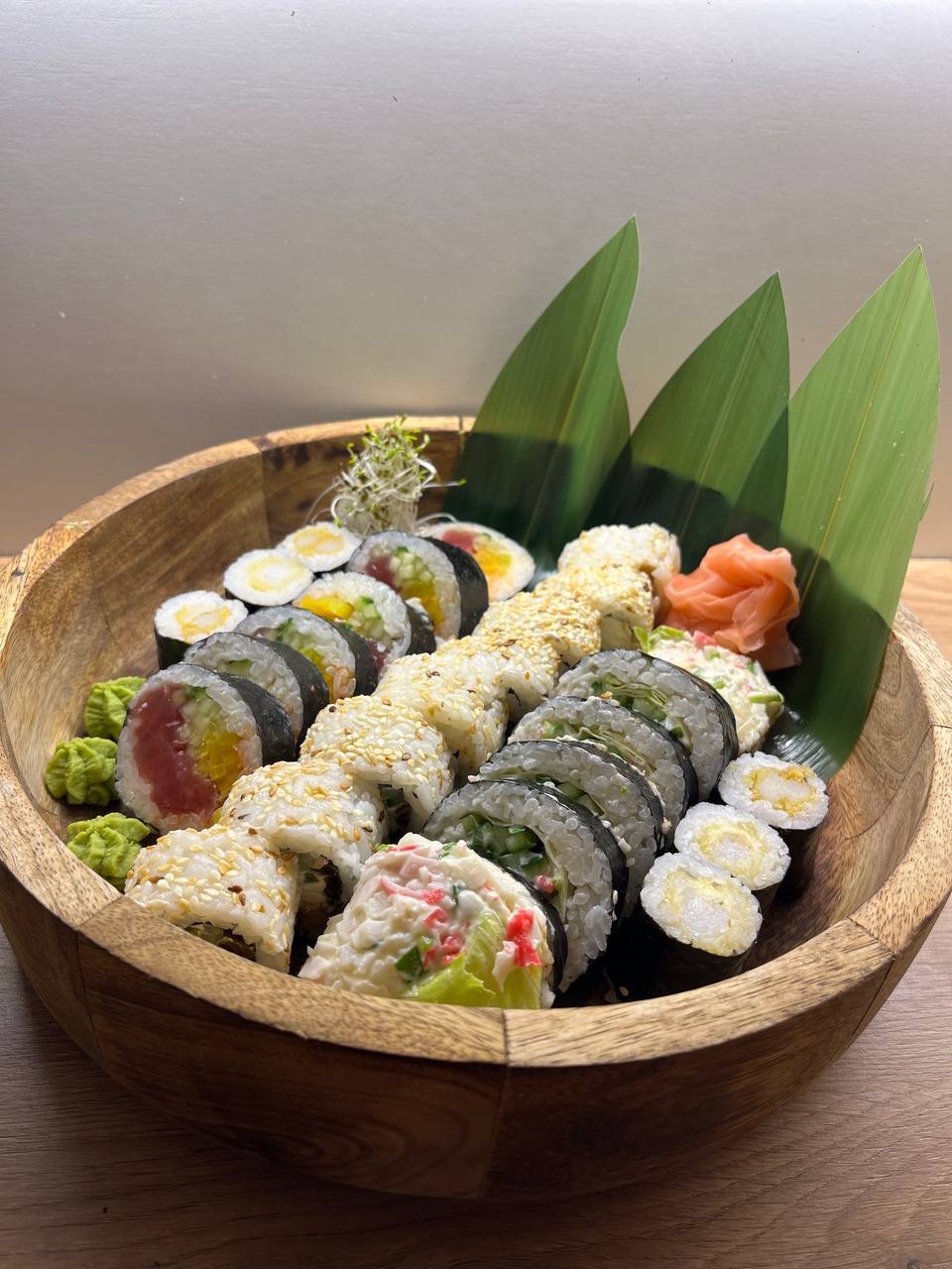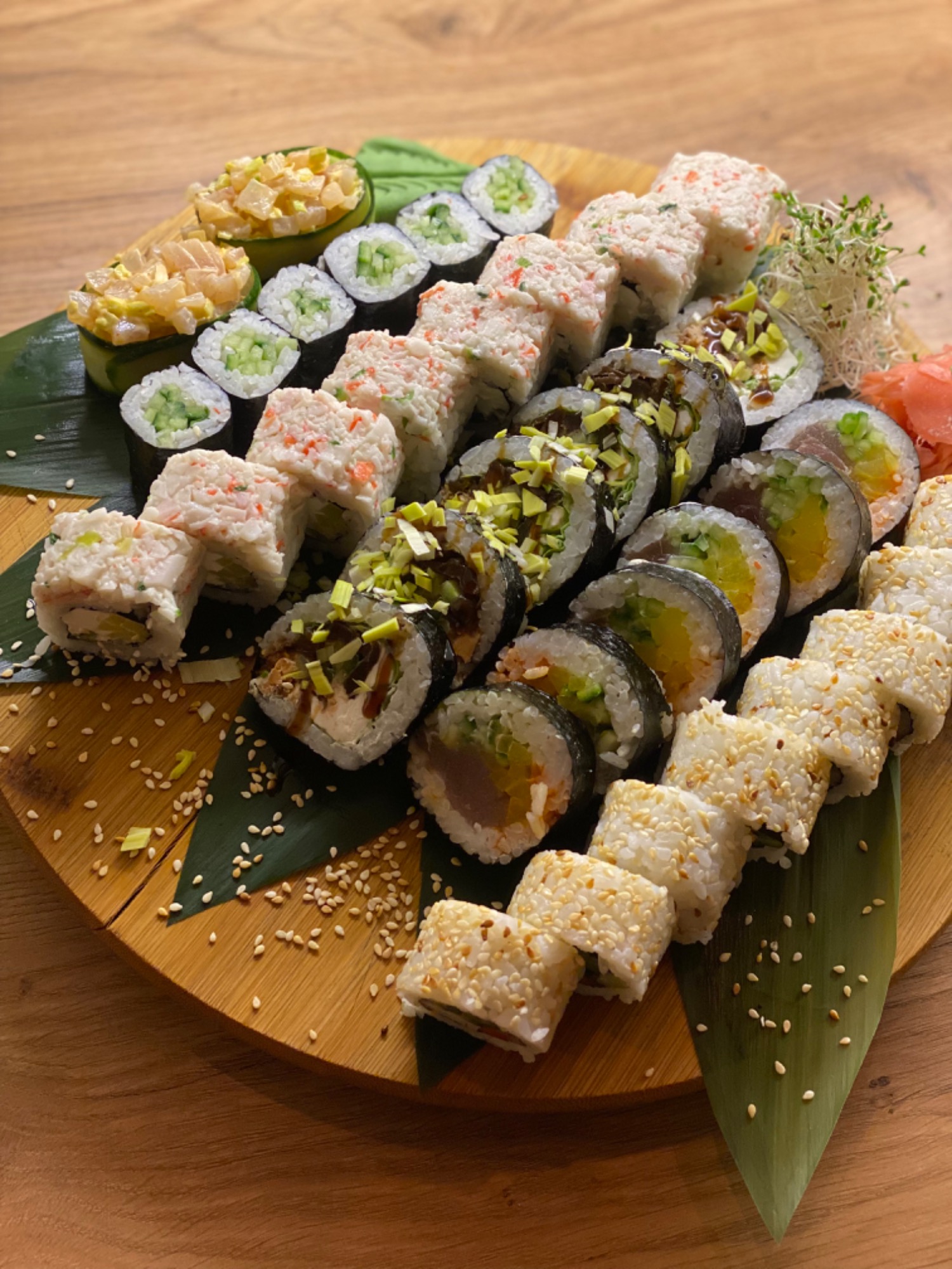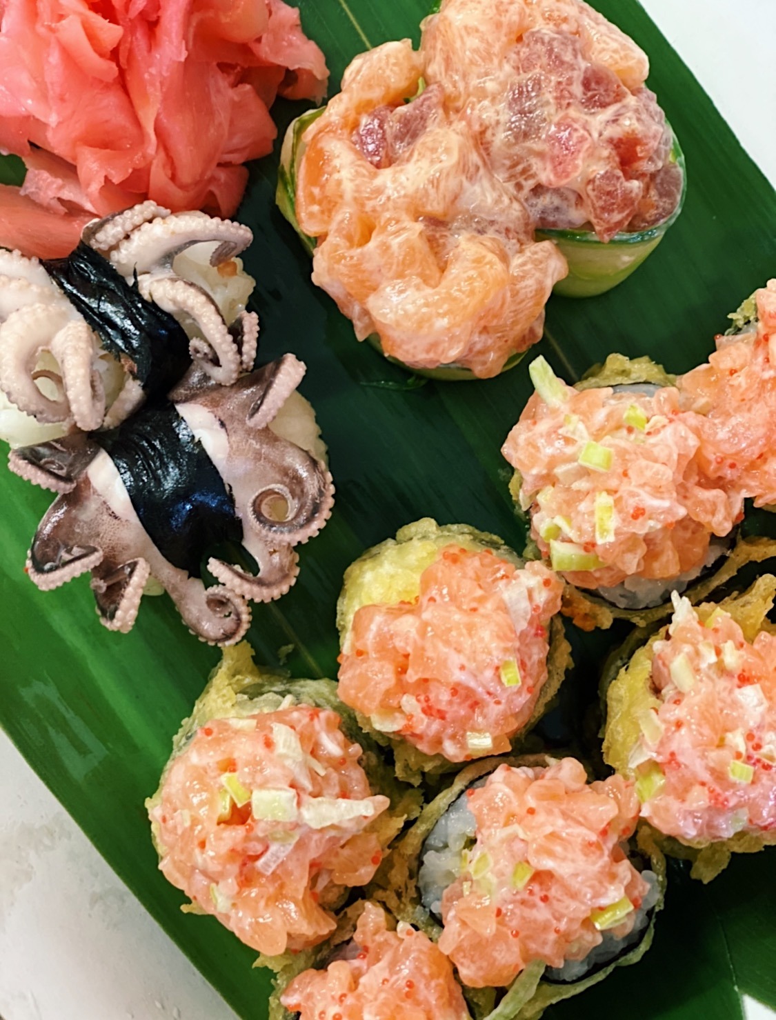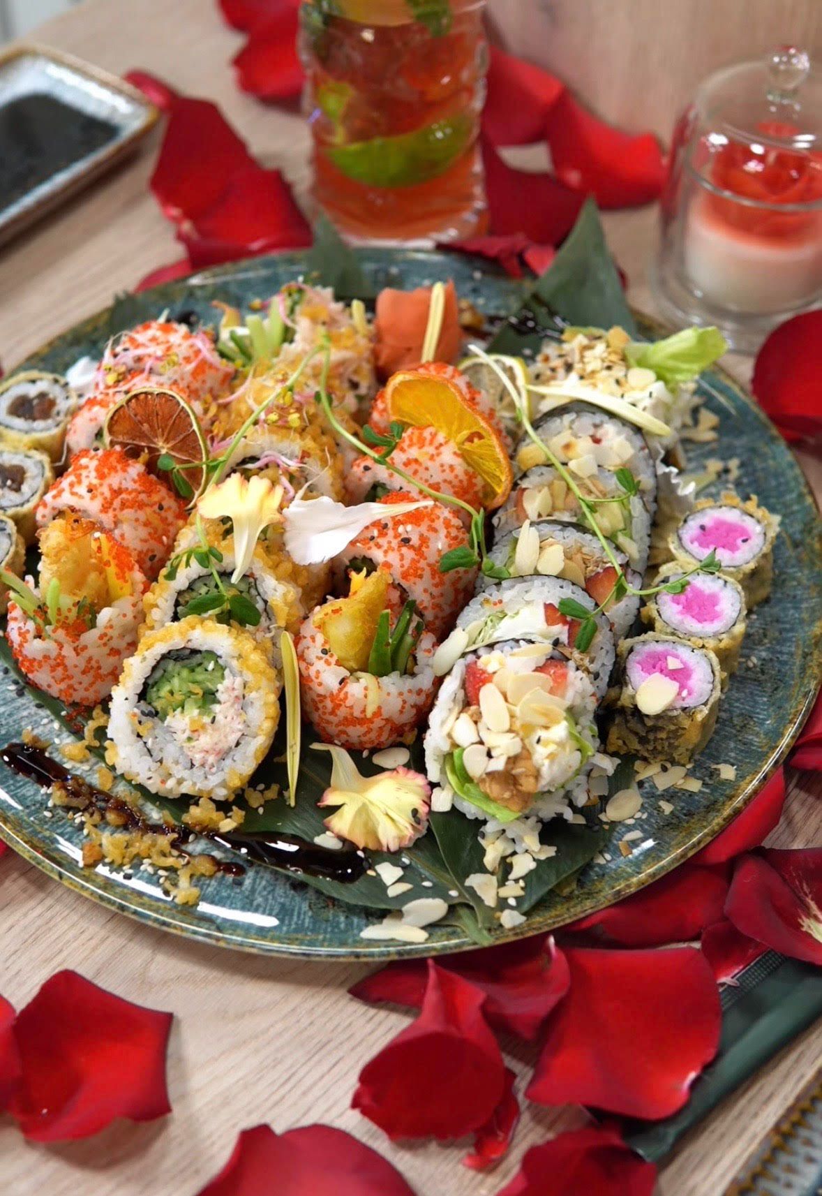 (Serek, ogórek, awokado, tobiko, zawinięte w łososia, tuńczyka i rybę maślanę)