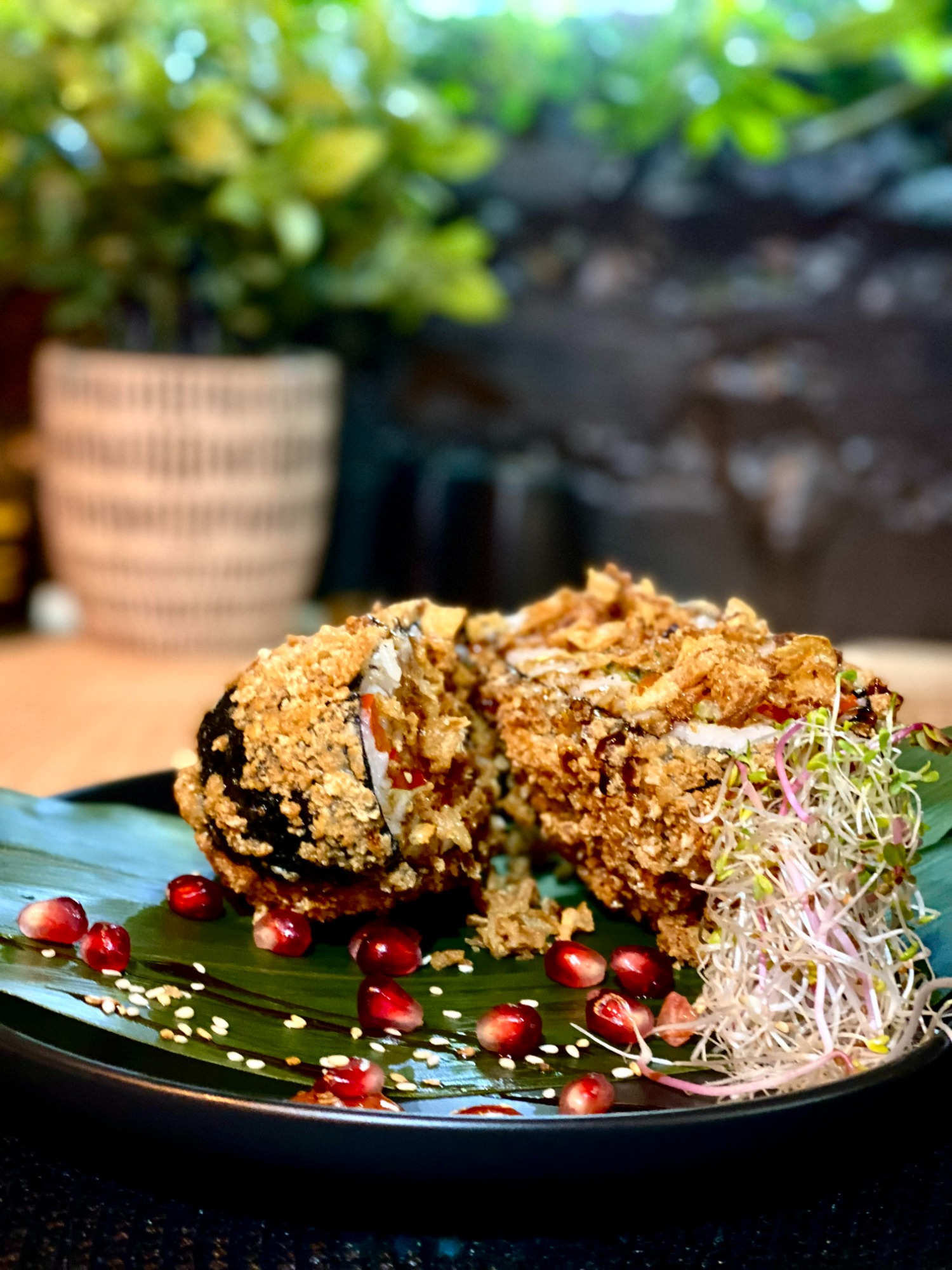 (ryż, krewetki tygrysie, papryka, ogórek, sałata, sosy słodko-kwaśny i tereyaki, nori, smażone w panko i posypane prażoną cebulką) -