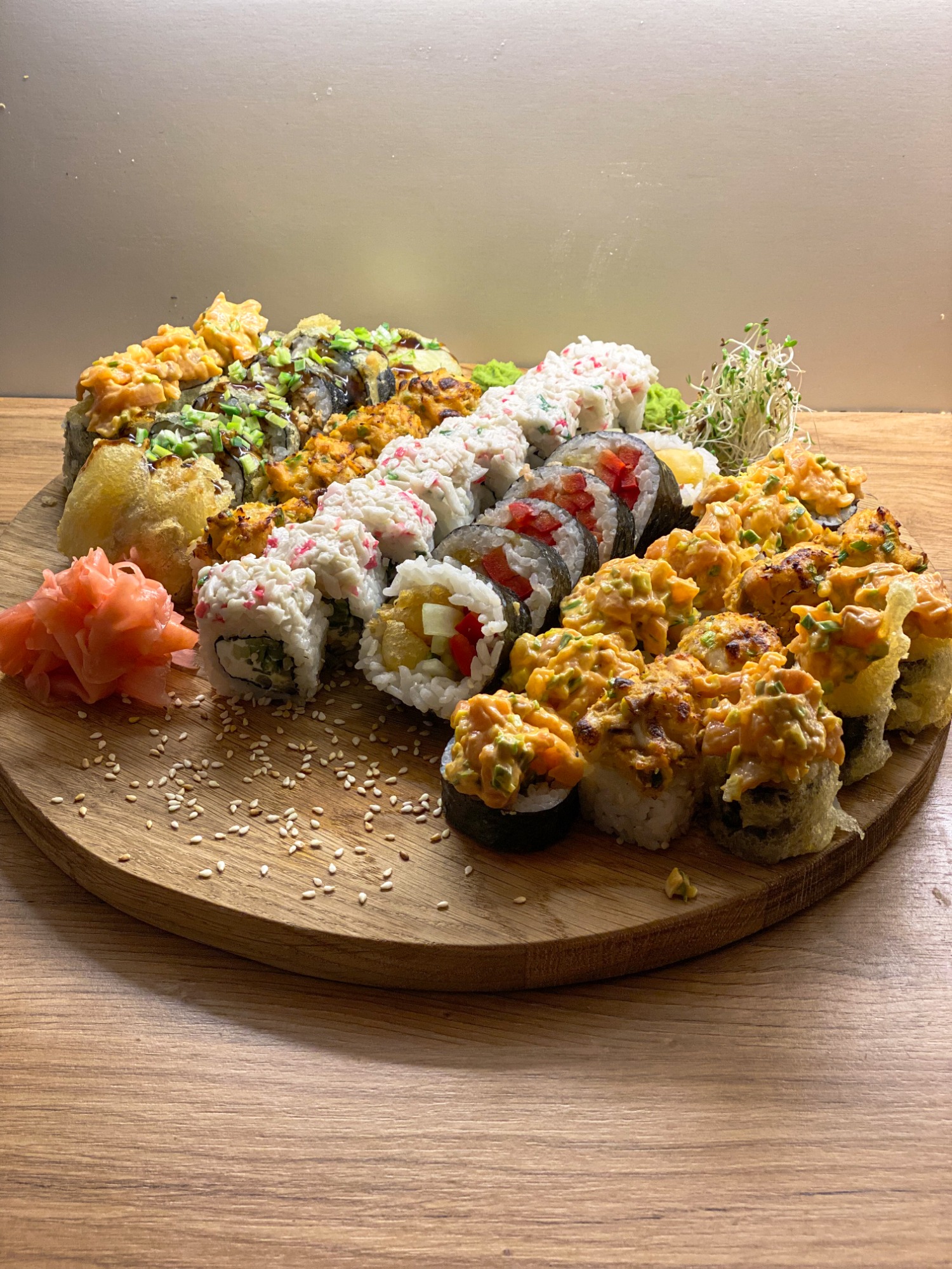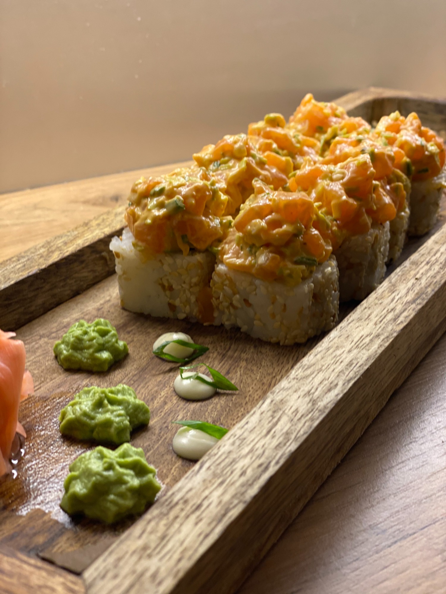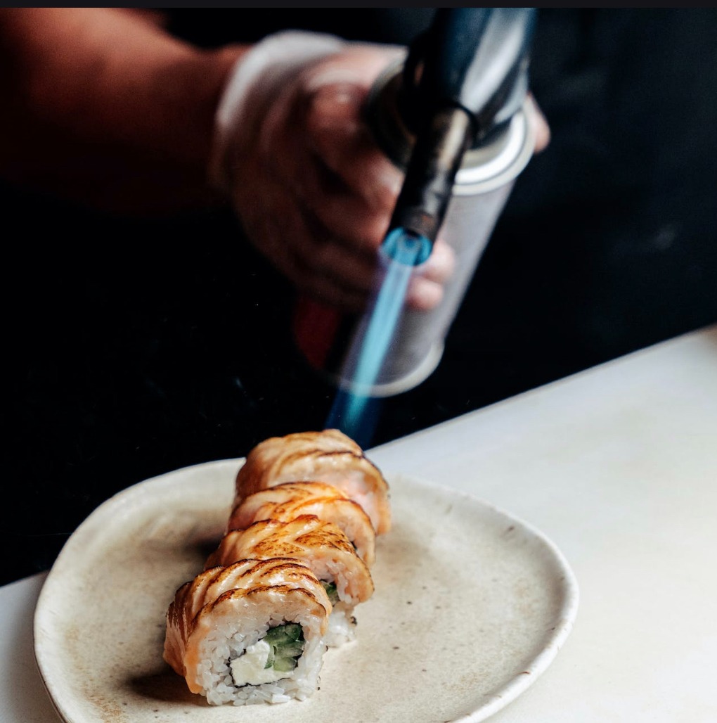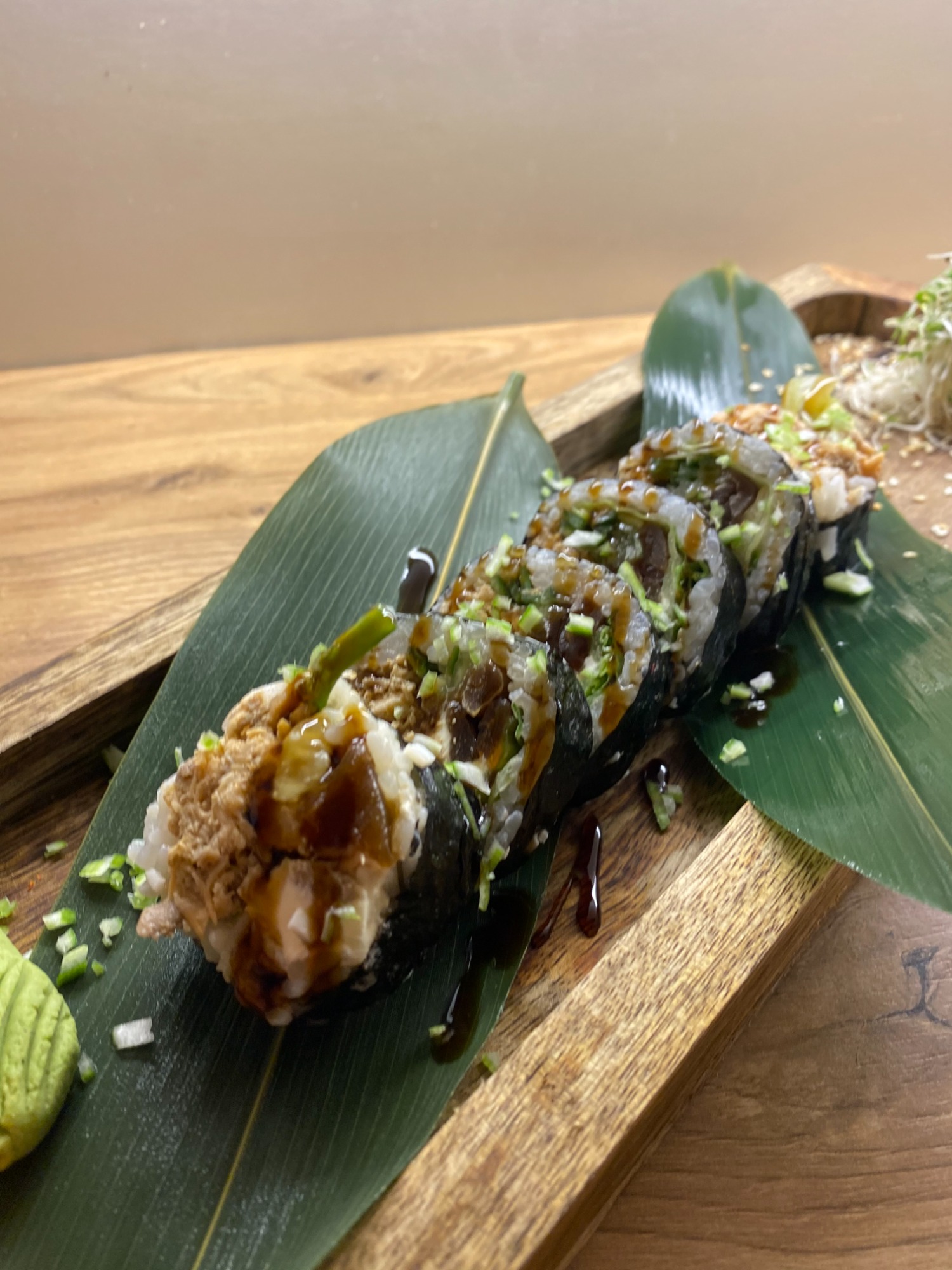 (Łosoś pieczony, masago, serek, sos majo, mozzarella, ogórek, kanpyo, por)