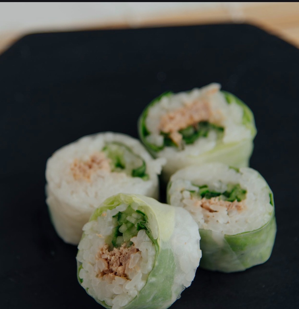 (ryż, tuńczyk, ogórek, takuan, sałata, sos ostry, nori, smażone w panko) -