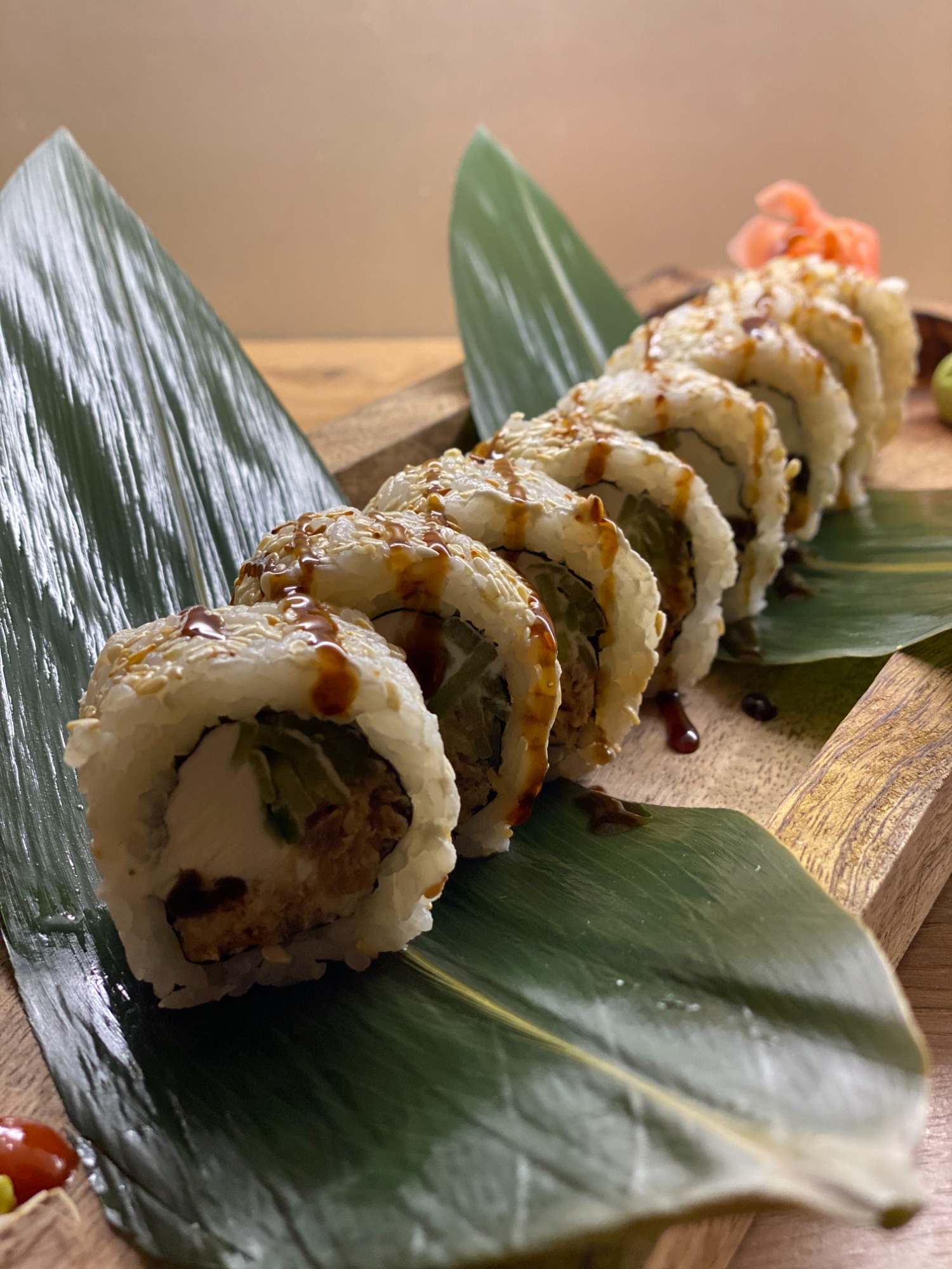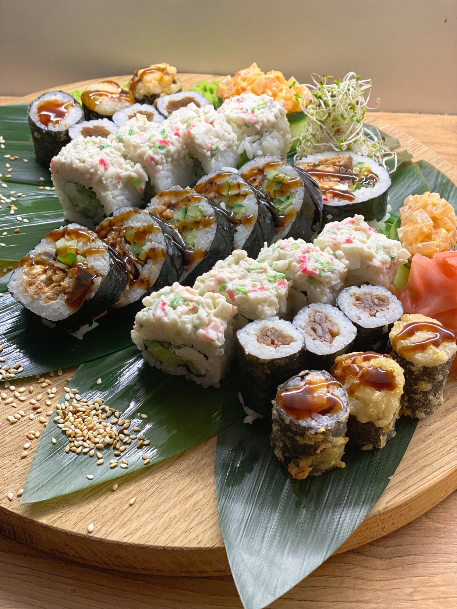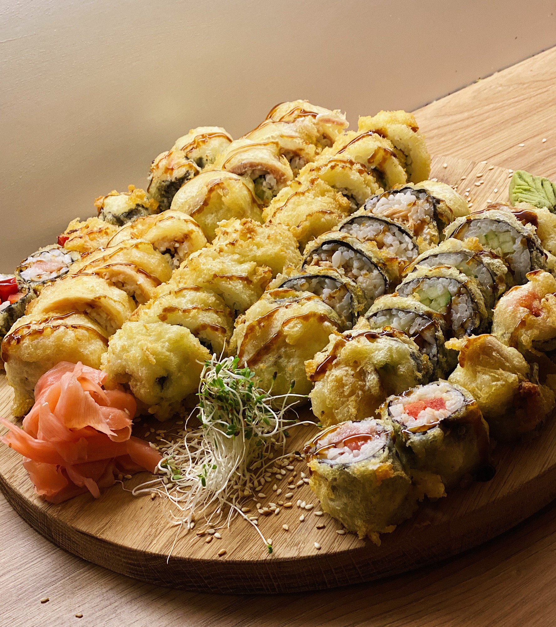 (Krewetki w tempurze, pieczony łosoś, ogórek, zawinięte w podpiekanego węgorza, polane sosem kabayaki)
