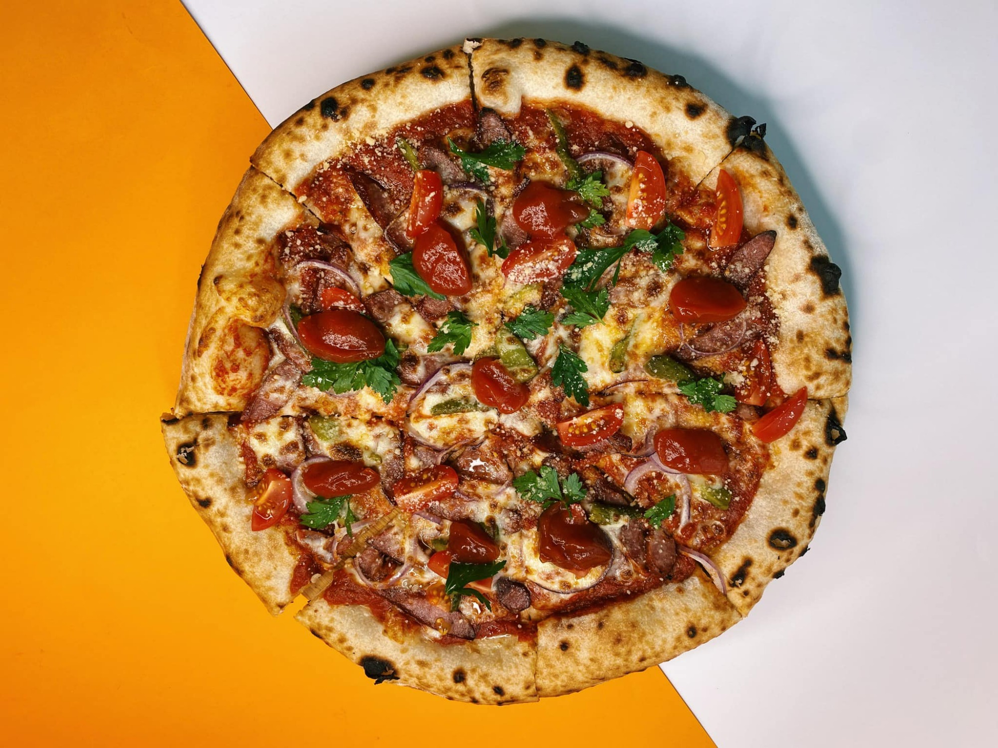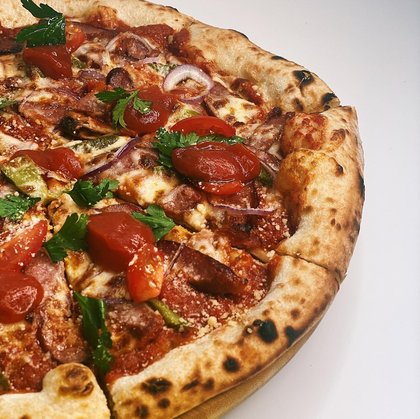 sos, mozzarella, pieczarki, salami, szynka, pomidor, oliwki czarne, bazylia, natka pietruszki, oregano -