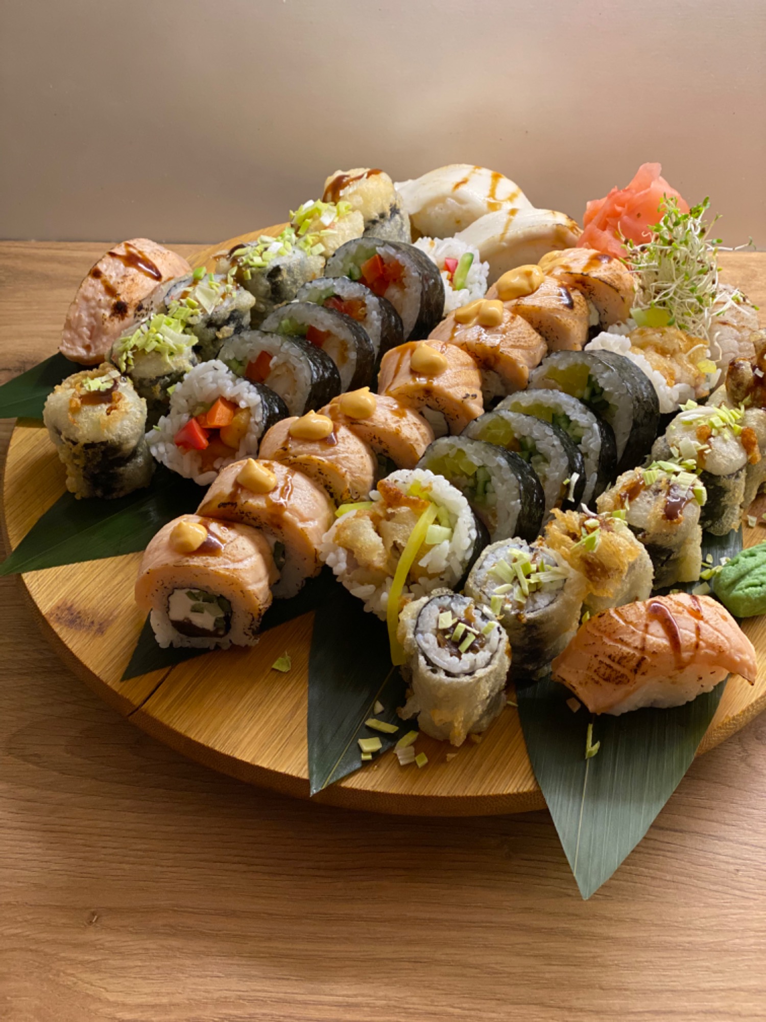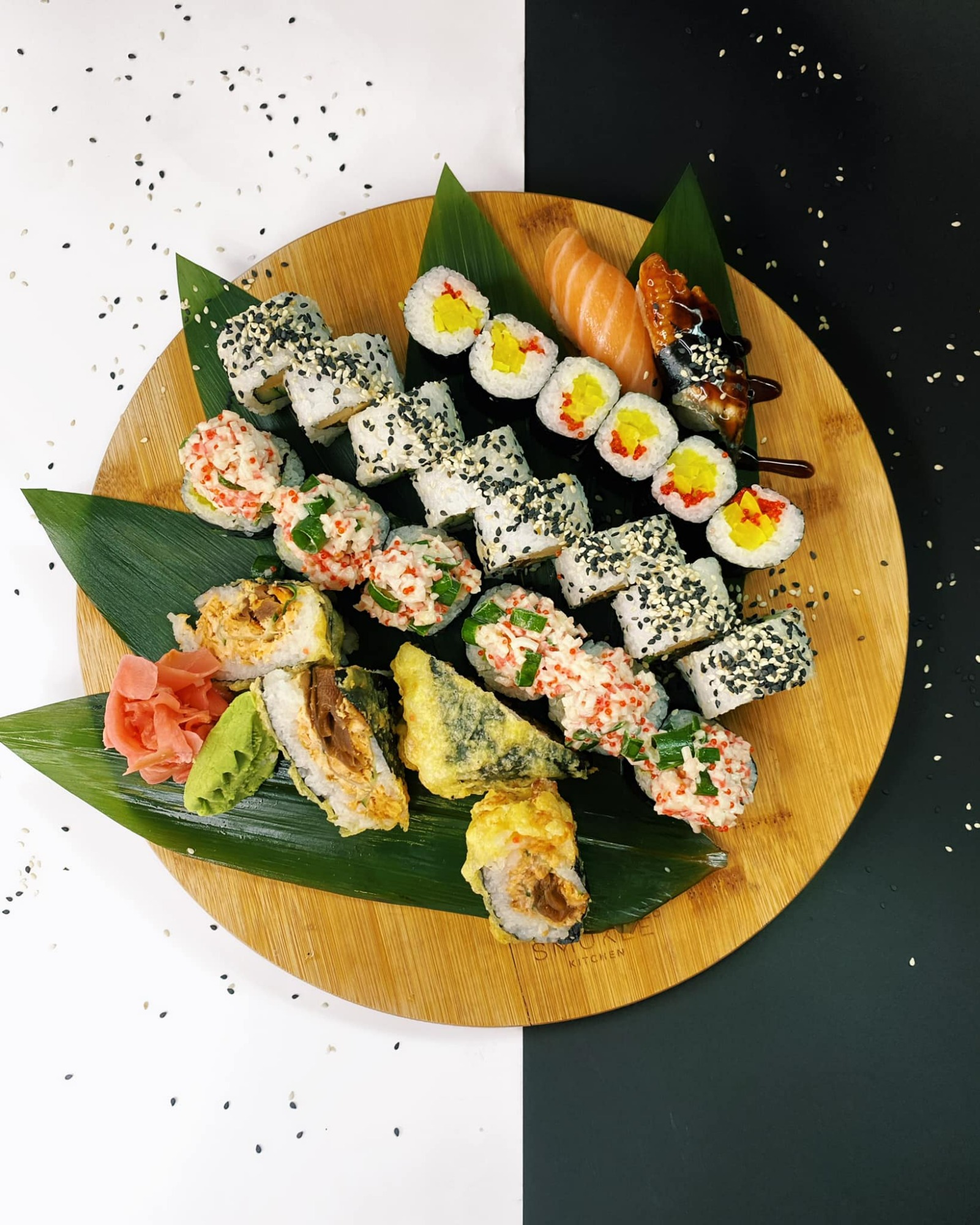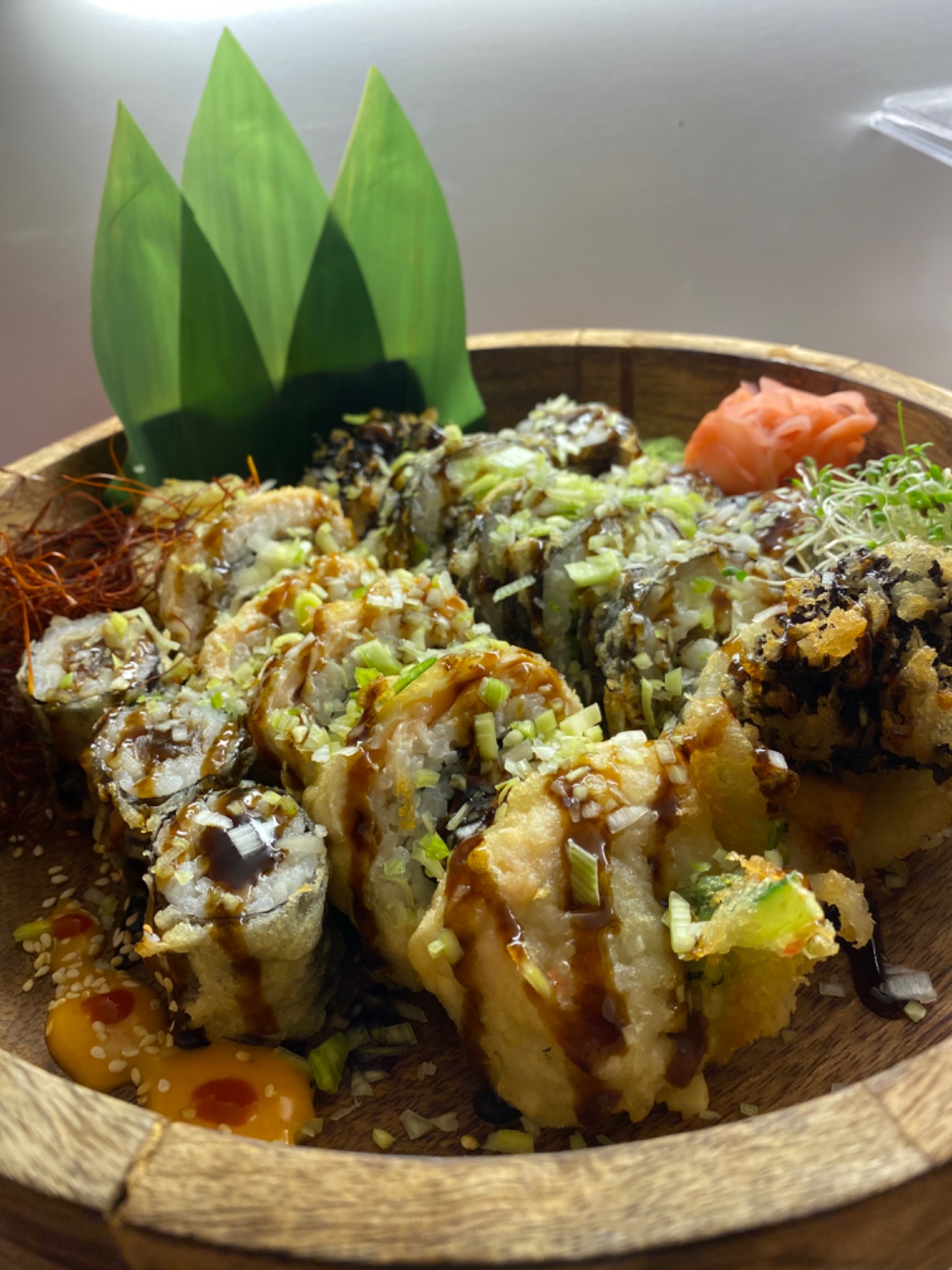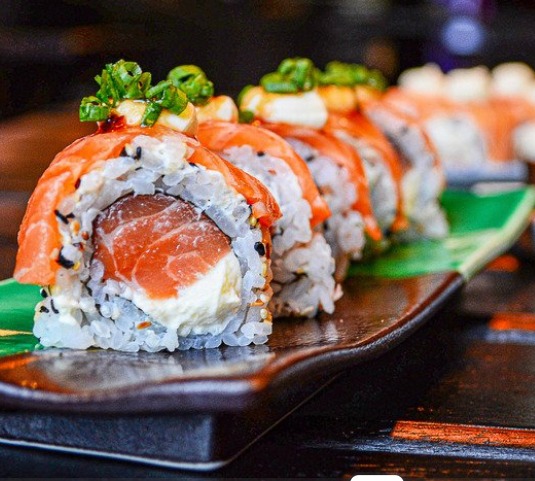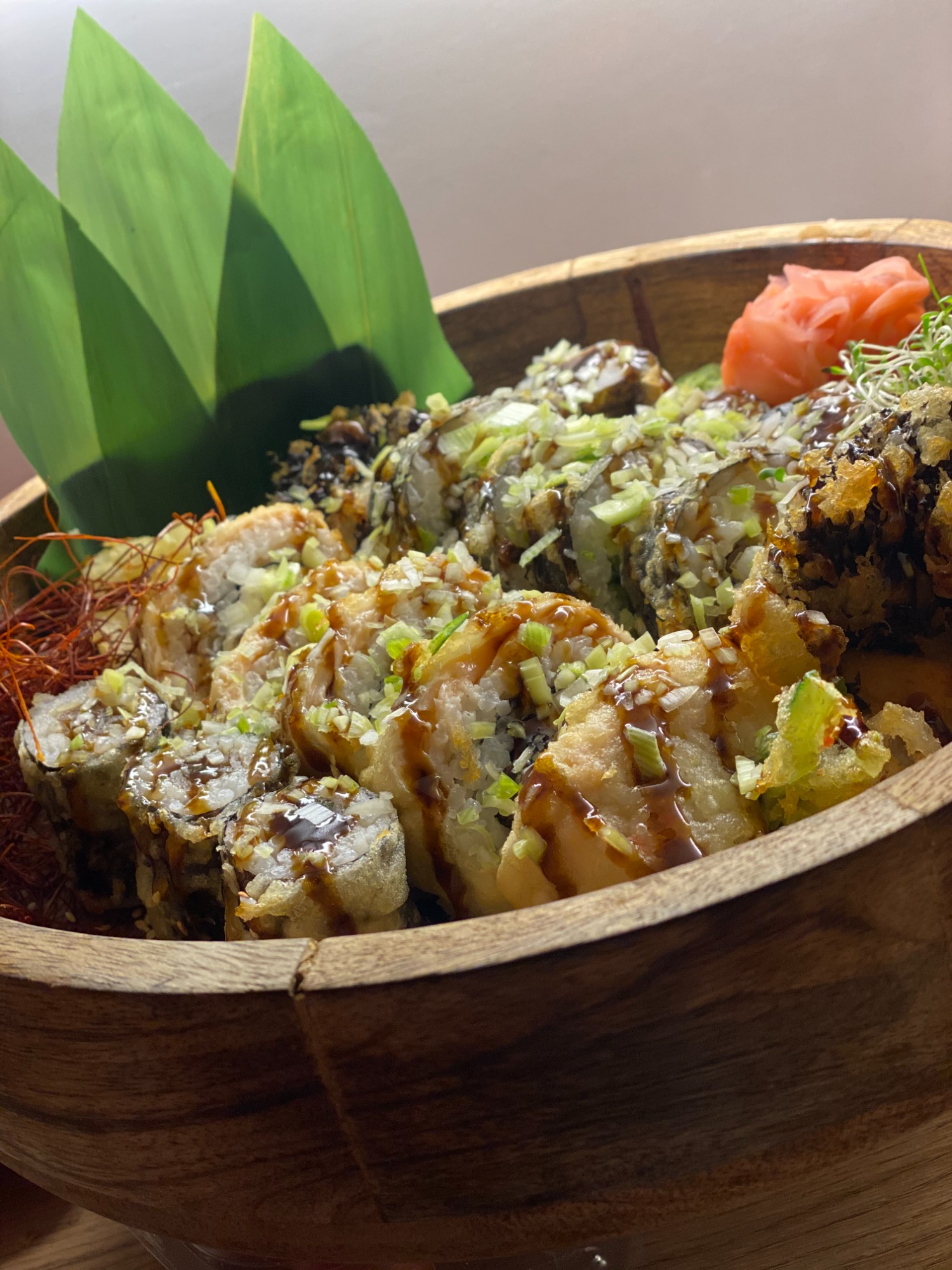 (ryż, pieczony łosoś, kalmary w tempurze, kanpyo, ogórek, serek Philadelphia, sałata, sos kabayaki, smażone w panko, posypane porem)