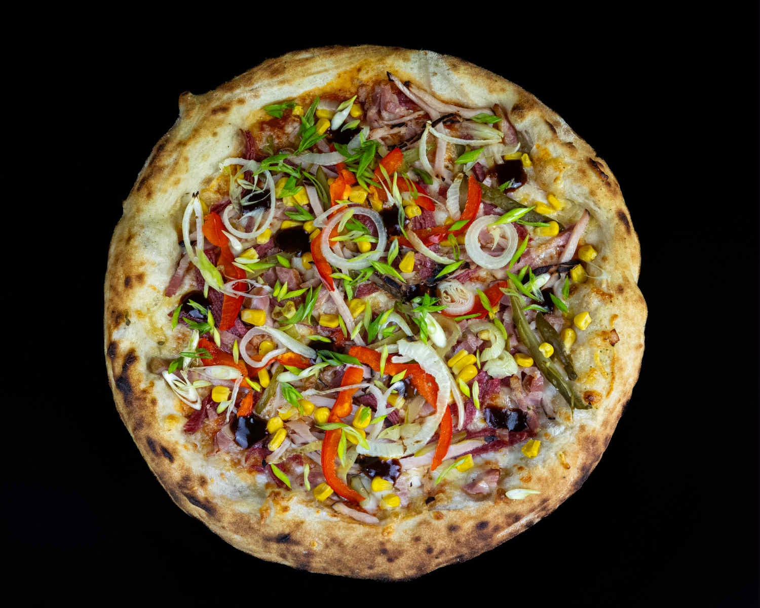 sos, mozzarella, kiełbaski, salami, boczek, papryka, cebula, ogórek kiszony, kukurydza, sos barbecue, szczypiorek, oregano -