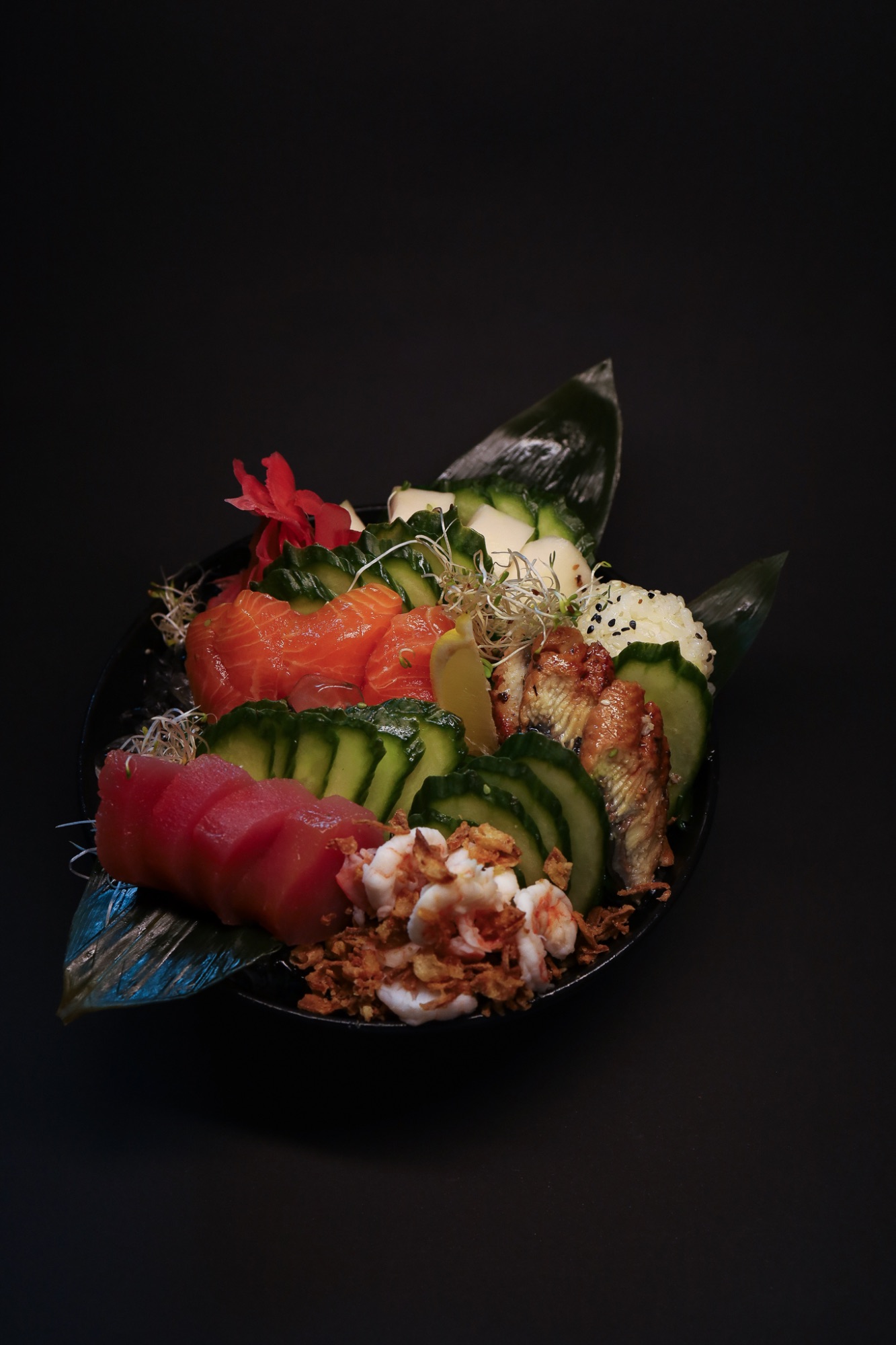 pieczony łosoś, kalmary w tempurze, sałatka krabowa, sałata, ogórek, smażony w panko, polany sosem kabayaki -
